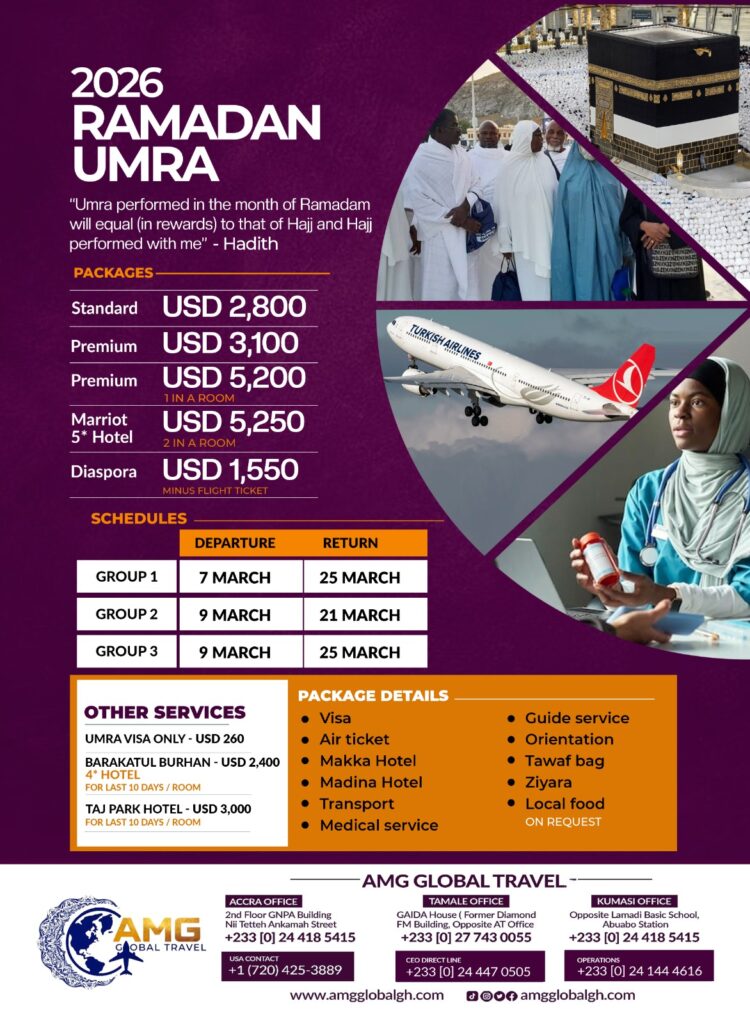 Accra, Ghana – AMG Global Travel has announced an exclusive Umrah package for Ramadan 2026, targeting Muslims who were unable to secure registration for the 2026 Hajj pilgrimage. The promotional campaign advises eligible worshippers to perform Umrah during Ramadan, citing the Hadith that “Umra performed in the month of Ramadam will equal (in rewards) to that of Hajj and Hajj performed with me”.